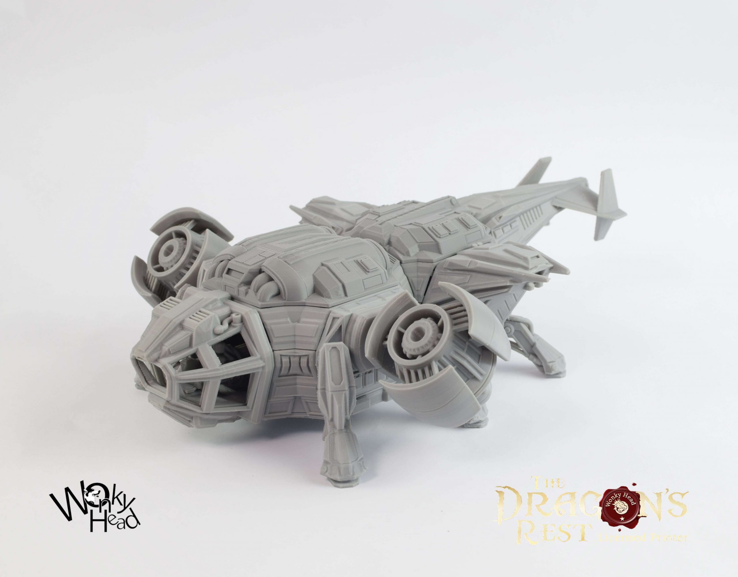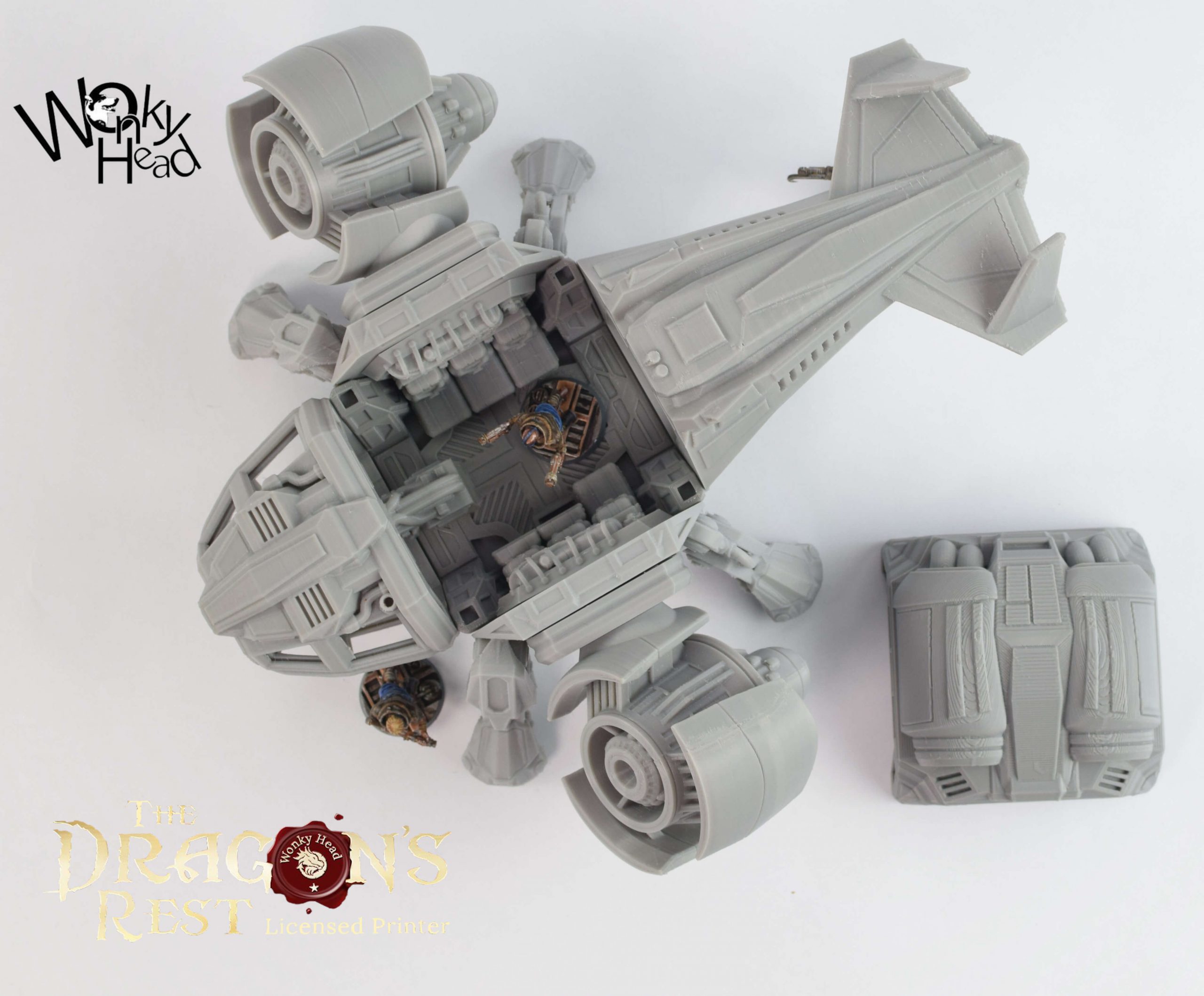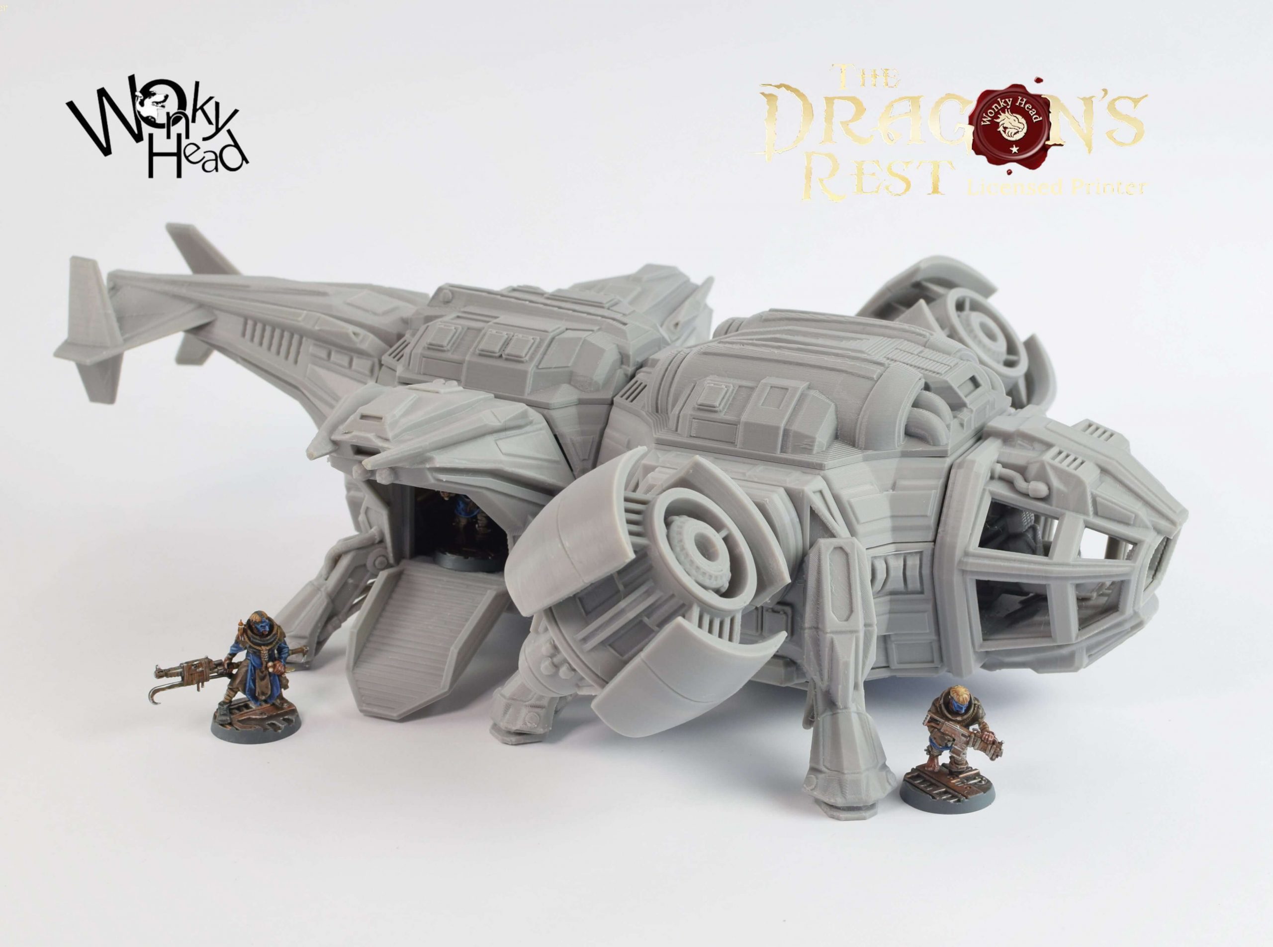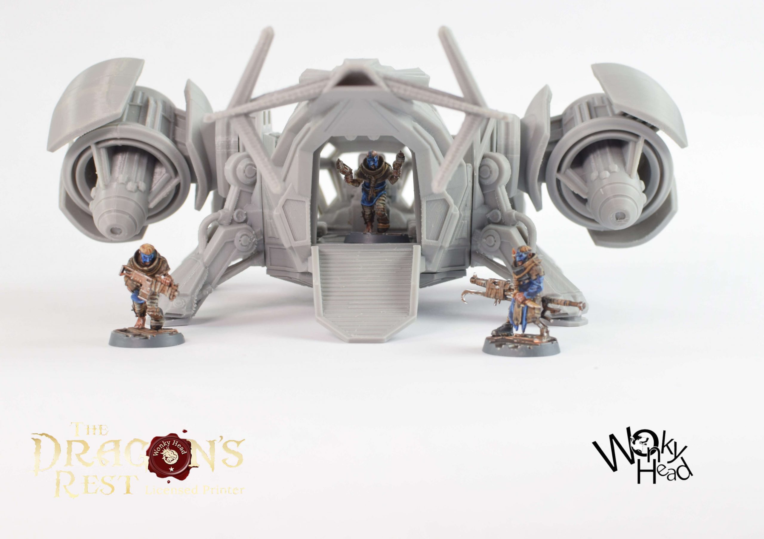 The Dragonfly is the larger big brother of the grasshopper vehicle and is made using parts from the Dragons rest Modular vehicle kit. The access doors open, the engines rotate and the top comes off so you can game inside it. The Dragonfly is suitable for use on any sci fi tabletop game board.