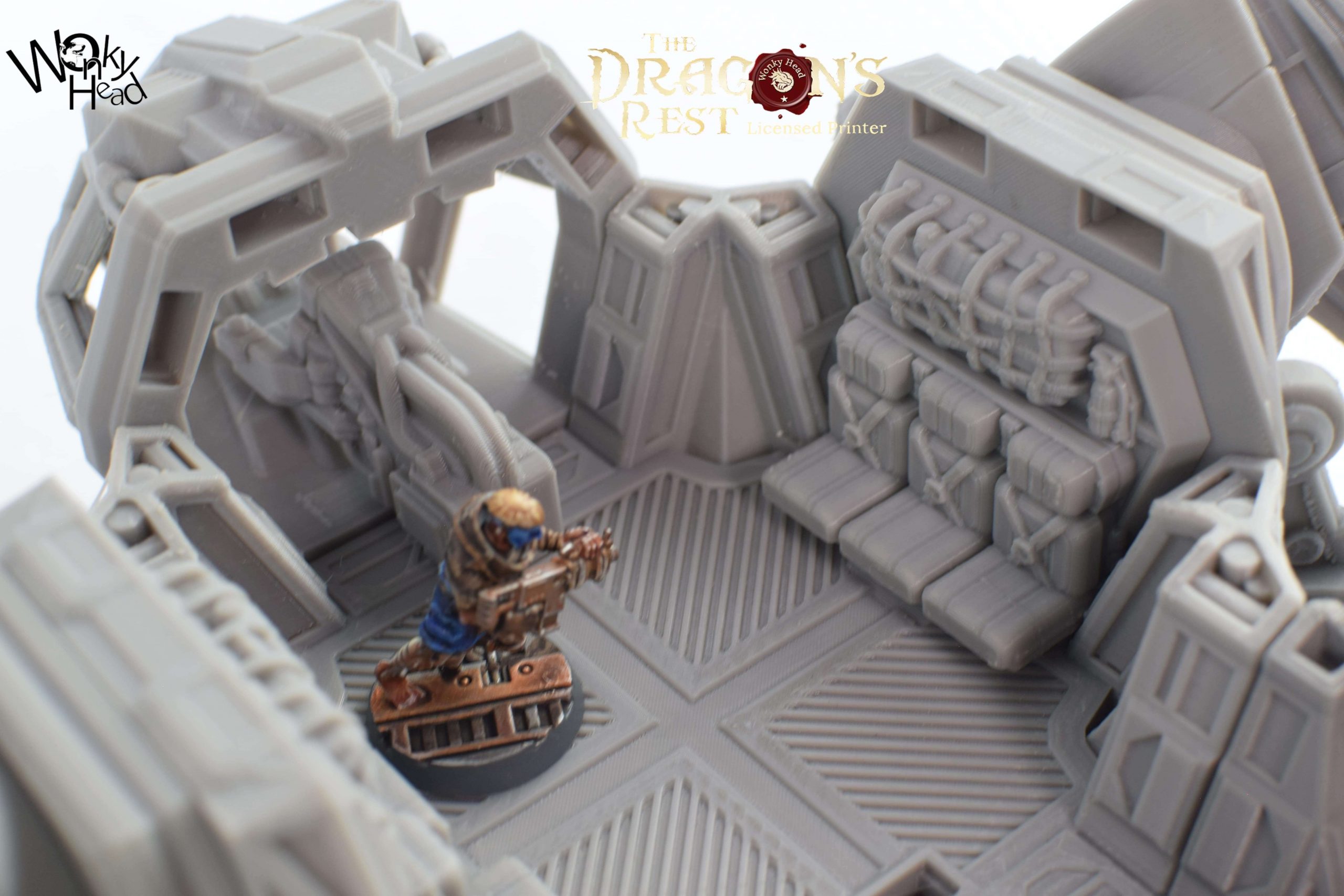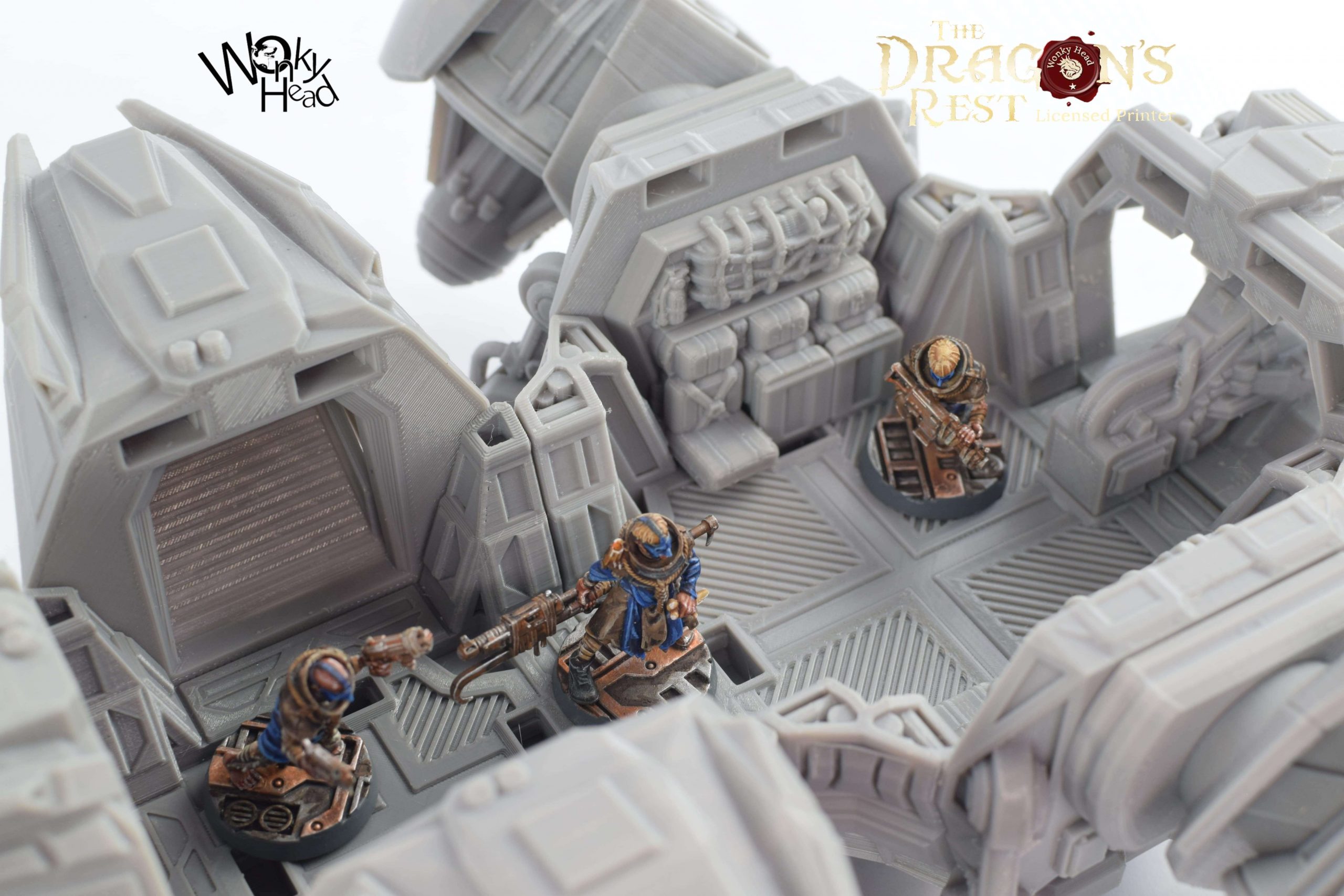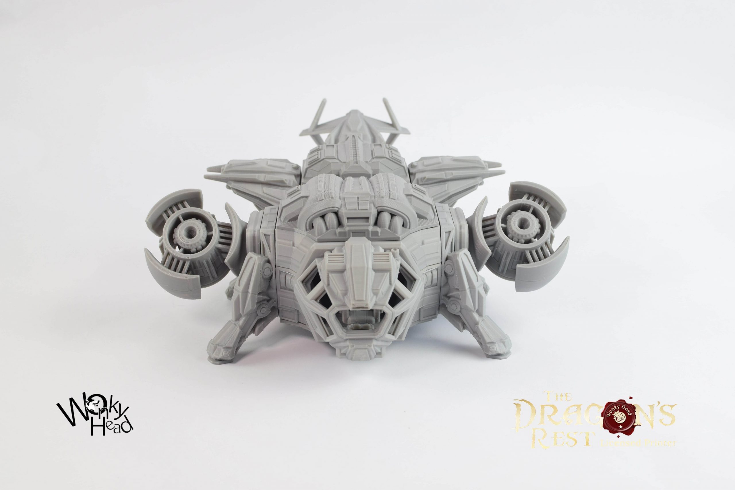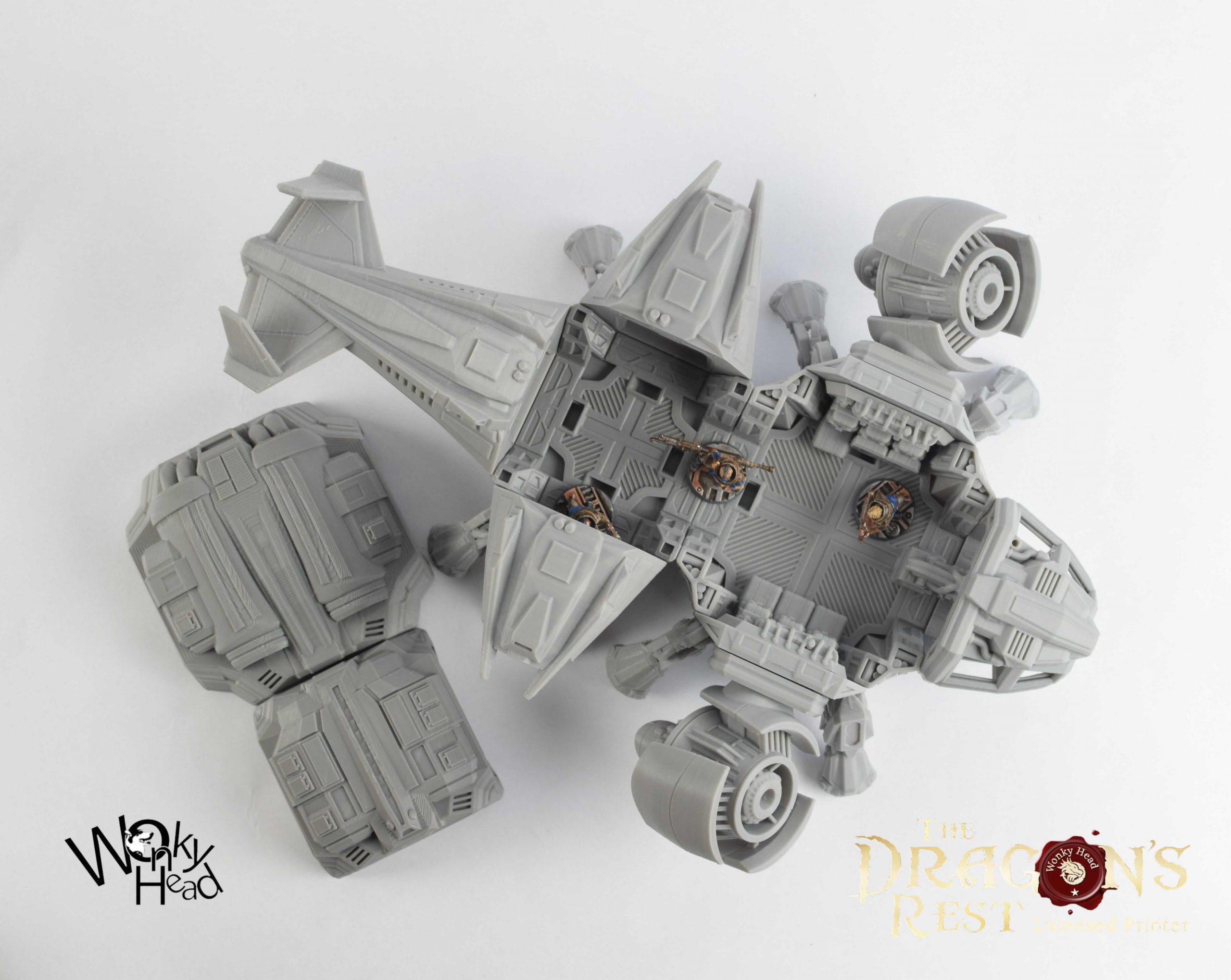 The Dragonfly is the larger big brother of the grasshopper vehicle and is made using parts from the Dragons rest Modular vehicle kit. The access doors open, the engines rotate and the top comes off so you can game inside it. The Dragonfly is suitable for use on any sci fi tabletop game board.